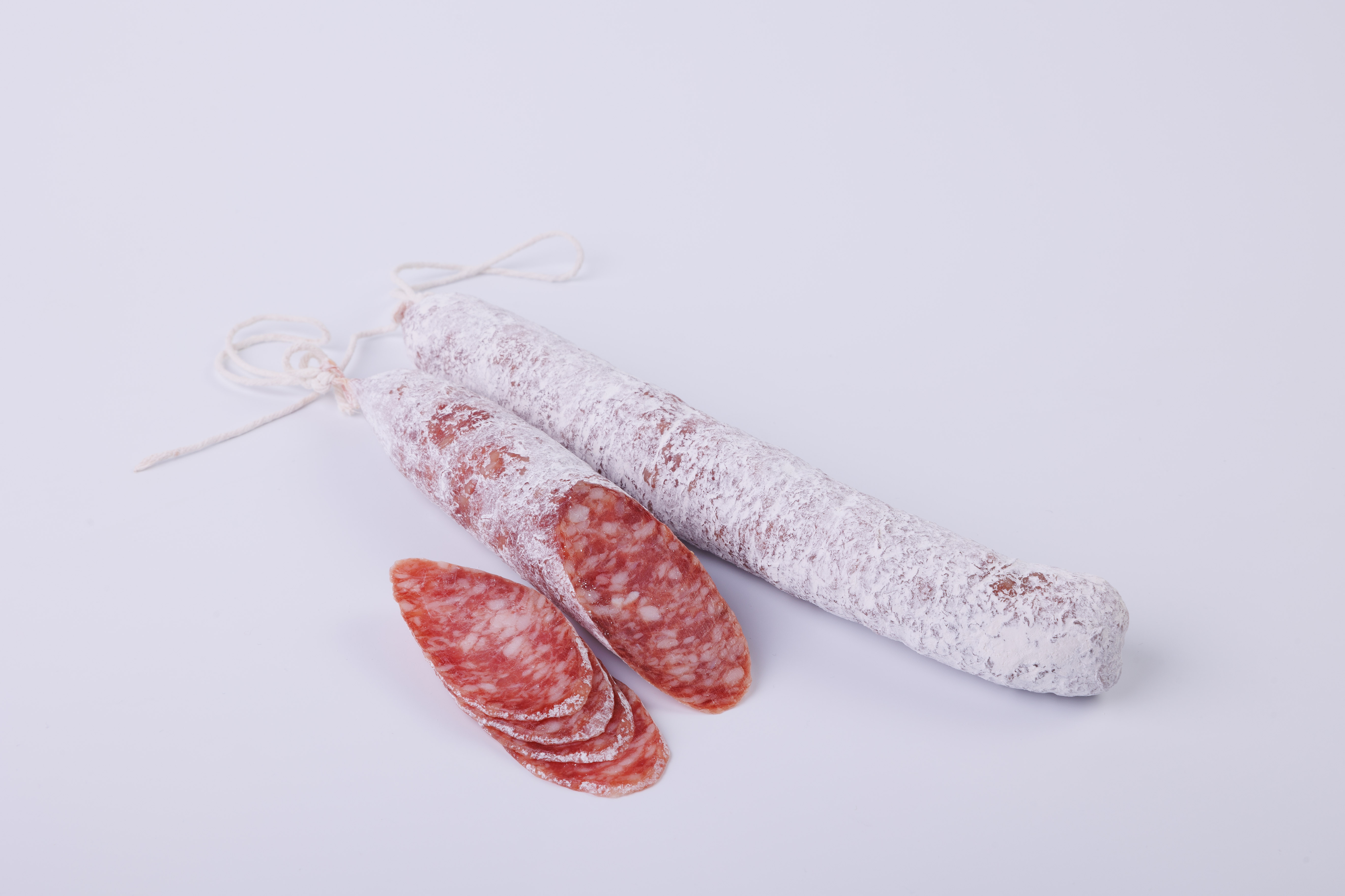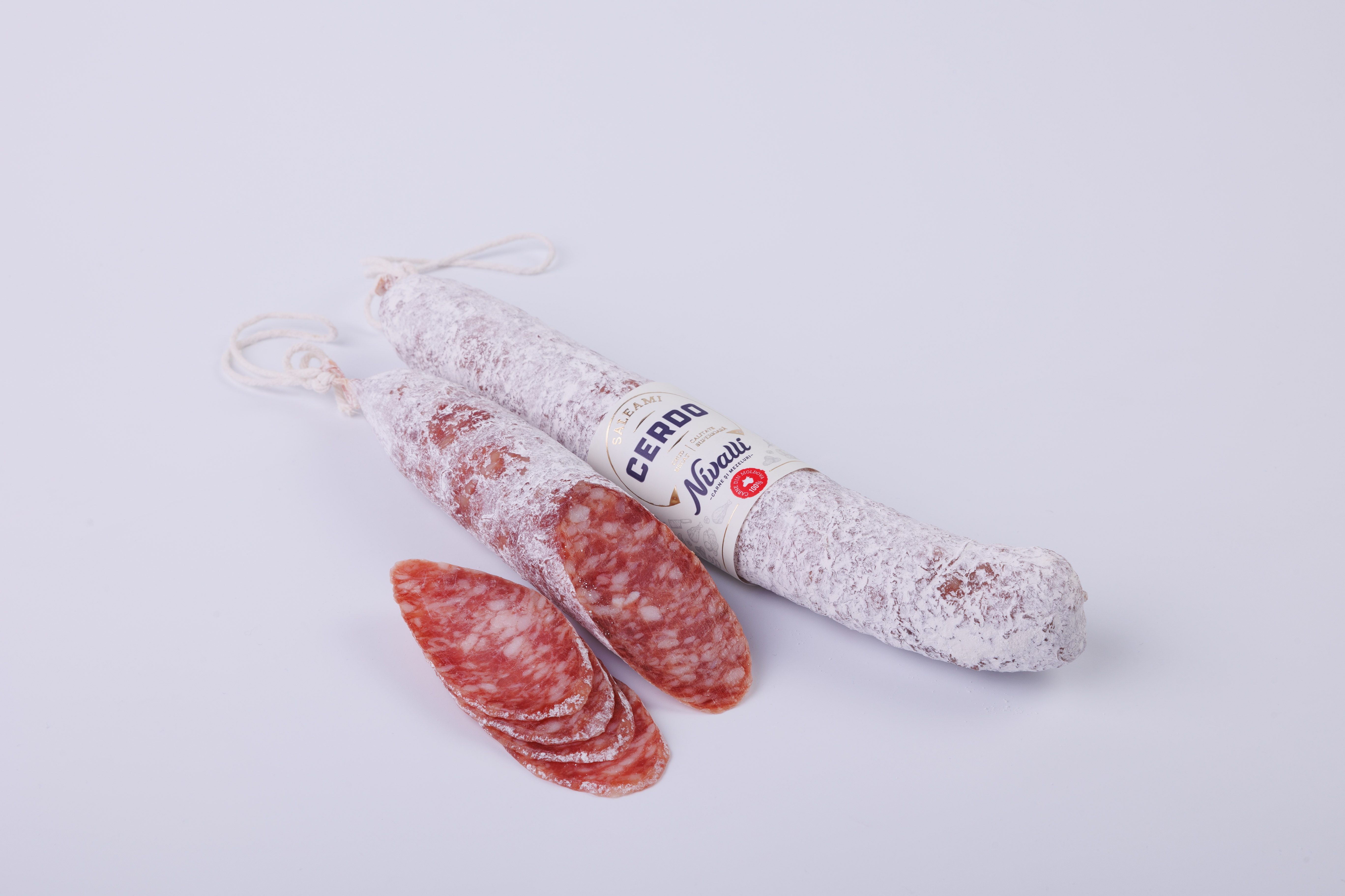 Салями Cerdo – открой для себя подлинный итальянский вкус, попробовав сыровяленое салями Cerdo у тебя дома. Для того, чтобы предать насыщенный вкус специй и мяса готовому продукту, салями Cerdo высшего сорта – сегмента Премиум – изготавливается из отборной свинины, с добавлением черного перца, корицы, мускатного ореха, гвоздики и чеснока. После чего приготовленный фарш наполняют в натуральную оболочку и оставляют созревать 30 дней при определенных условиях. Этот безусловный деликатес перед подачей рекомендуется нарезать очень тонко и сочетать с сыром, вином, ломтиками ароматного багета или как дополнение к любым праздничным закускам.